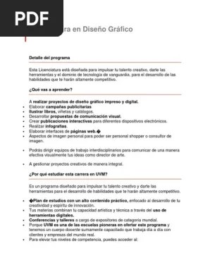 Mapa de ruta para las industrias creativas digitales. 0% a un 0% le pareció que este documento no es útil, marcar este documento como no útil. Federico vujosevich, director nacional de negocios uvm. Carrera certificada por 5 años. Actualmente, el reto de un diseñador gráfico es crear contenidos visuales que sean funcionales en un contexto internacional, para todas las plataformas digitales que han surgido.