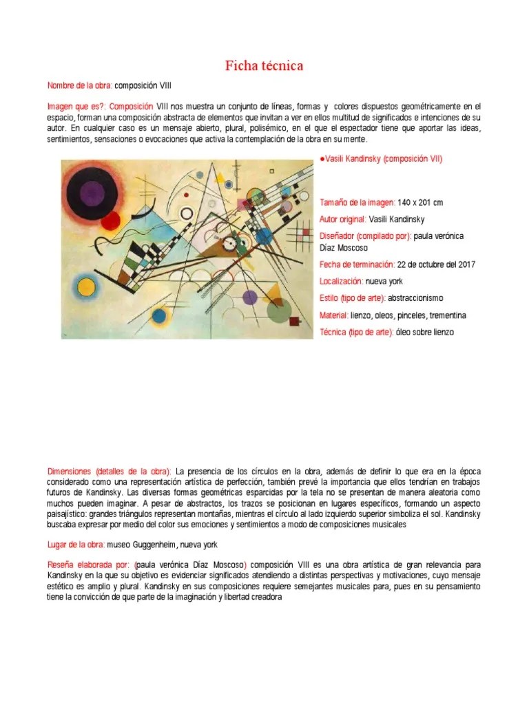 16.12.2015 · composición 8 ejemplo del arte del creador oficial del arte abstracto wassily kandinsky. Por aquel entonces, este enfoque de la pintura se consideraba revolucionario. Vemos un fondo casi plano pero tiene unos tenues colores que dan sensación de profundidad de infinitud de espacio profundo. Composición viii , pintura de una fiera vivacidad , aunque también serena , se considera una de las telas más importantes que el artsita realizó tras la primera guerra mundial.durante los años que pasó en la bauhaus , entre 1922 y 1926, kandinsky expuso y desarrolló sus teorías de la forma.composición viii fue la primera aplicación metódica de las ideas del artista sobre la. Guggenheim e imaginen que visitan el estudio de kandinsky en 1929. Composición viii representa un conjunto de líneas, formas y colores dispuestos en el espacio, dando origen a una composición abstracta de elementos que invitan a descubrir múltiples significados e intenciones del autor. La interpretación es abierta y el espectador. Su aportación pionera al arte de vanguardia había sido la pintura sin tema, con la que instó a la abstracción.