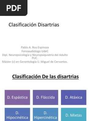 La disartria consiste en una alteración de la articulación del lenguaje, mientras la disfasia es un defecto en los mecanismos receptivos, expresivos o integradores del lenguaje. La disartria espástica se debe a lesiones en los tractos piramidales, relacionados con el control motor fino de los músculos de la cara y del cuello. La disartria consiste en una alteración de la articulación del lenguaje, mientras la disfasia es un defecto en los mecanismos receptivos, expresivos o integradores del lenguaje. Exploración de pares craneales la exploración de los pares craneales resulta básica. No percibe sonidos ix / x... Las enfermedades mitocondriales son un grupo muy heterogéneo de trastornos que surgen como resultado de la disfunción de la cadena respiratoria mitocondrial.
